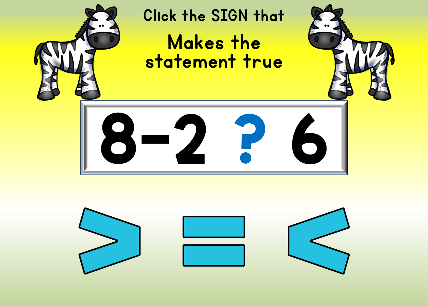 Your mission? To click the correct sign (>, =, or <) that makes this statement true.