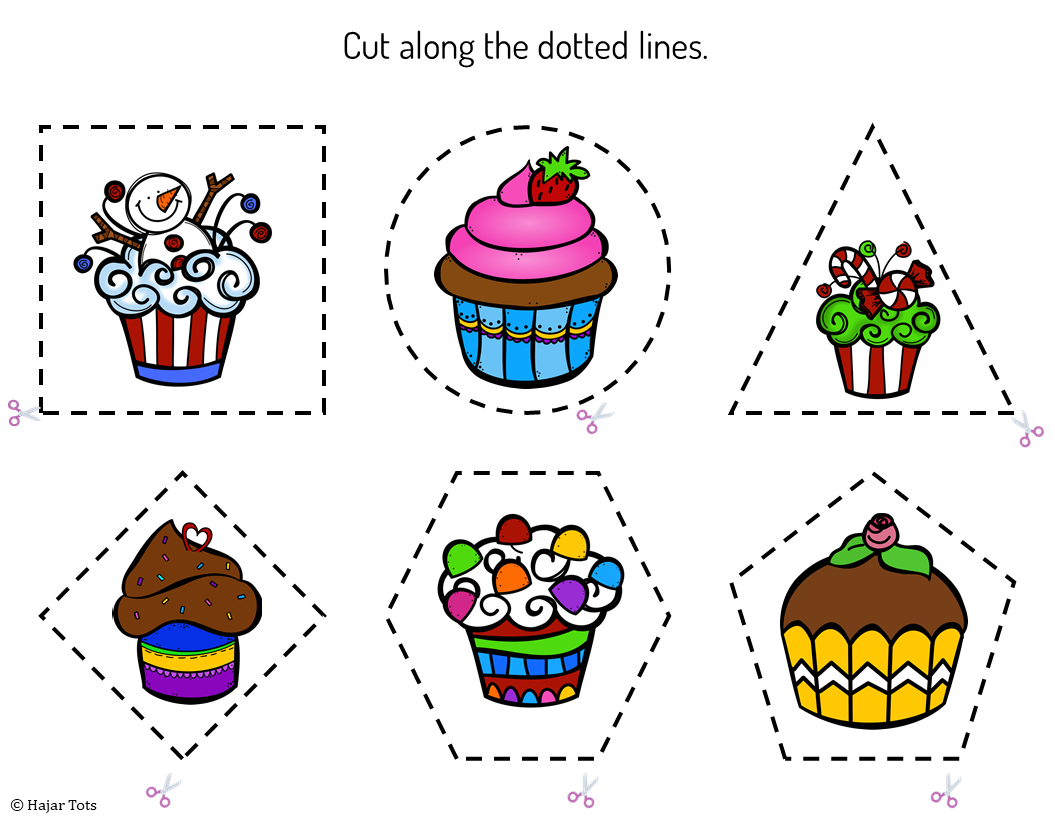 From squares to pentagons, children practice cutting along dotted lines to free these tasty treats from their shape prisons.