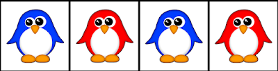Welcome to the Penguin Parade! Here, our blue and red feathered friends are lined up, ready for their first scissor adventure.